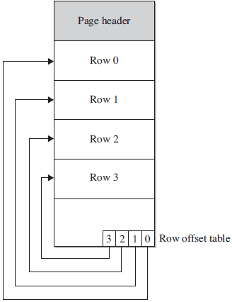 The last part of a page is tightly connected to a space reserved for data, because each row stored on a page has a corresponding entry in the row offset table (see Figure 15-1). The row offset table contains 2-byte entries consisting of the row number and the offset byte address of the row on the page. (The entries in the row offset table are in reverse order from the sequence of the rows on the page.) Suppose that each row of a table is fixed-length, 36 bytes in length.